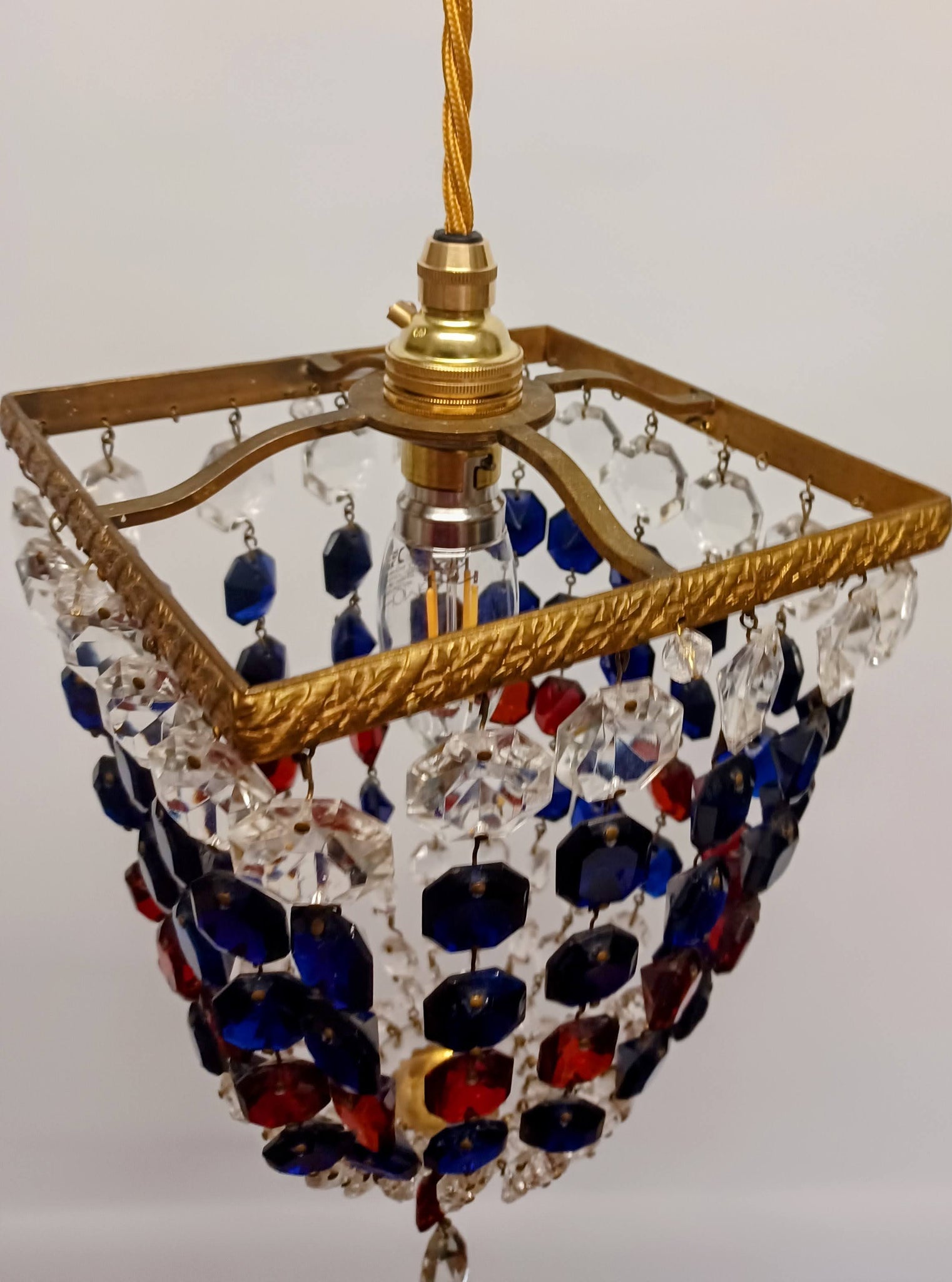 A RARE AND UNUSUAL SQAURE FRAMED VINTAGE CRYSTAL BASKET WITH CLEAR, SATURATED BLUE AND RICH RED CRYSTALS.