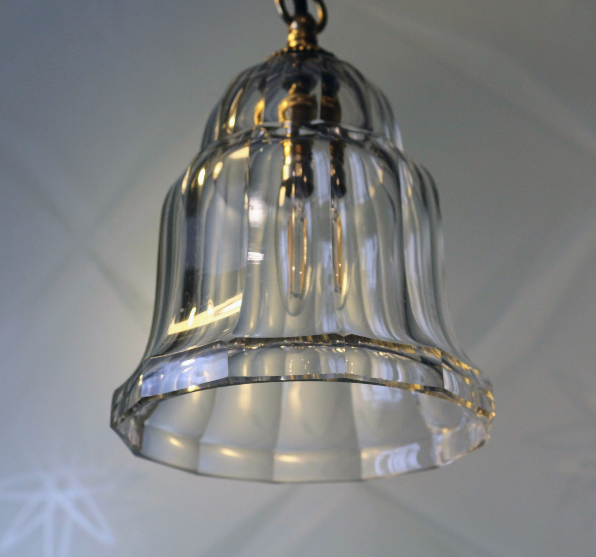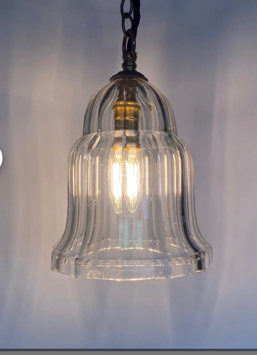This is a really lovely little vintage pendant light which would look lovely in an office, bedroom or living space. It has a lovely curved bell shape shad made from thick antique glass.