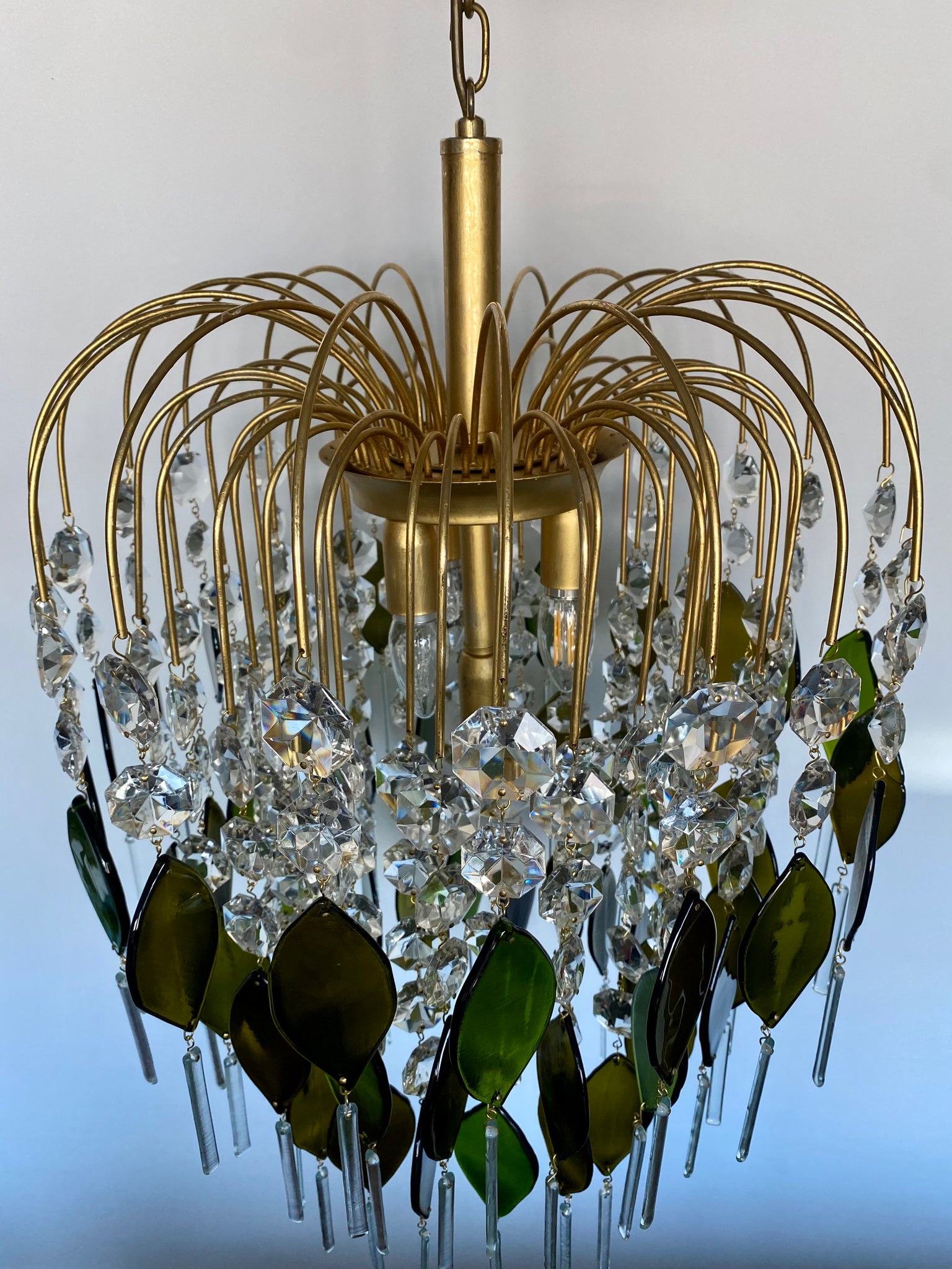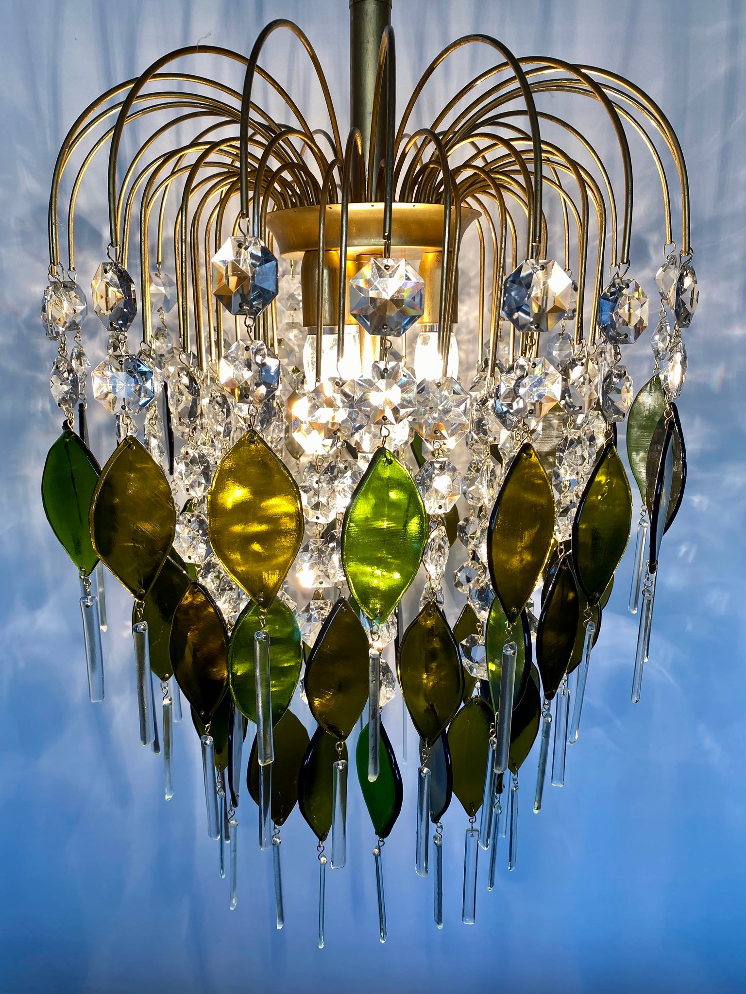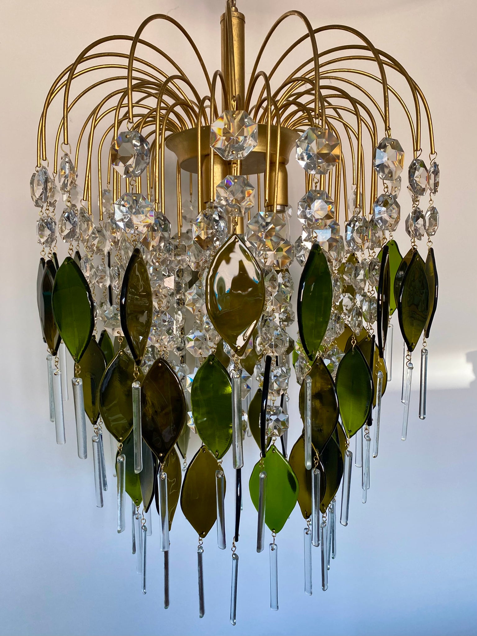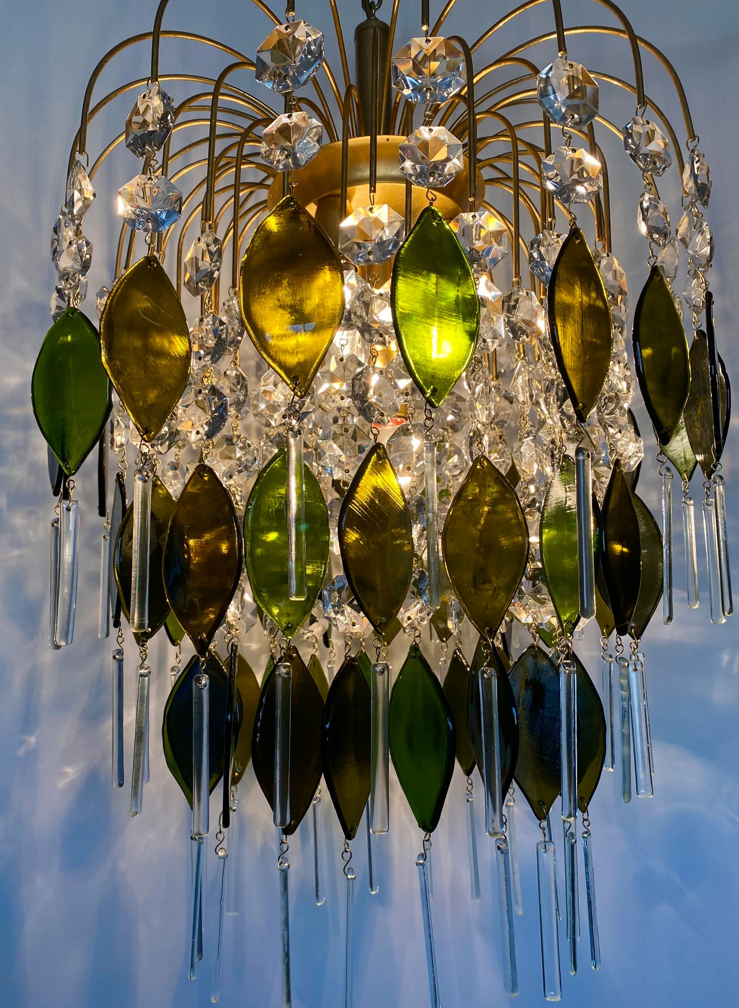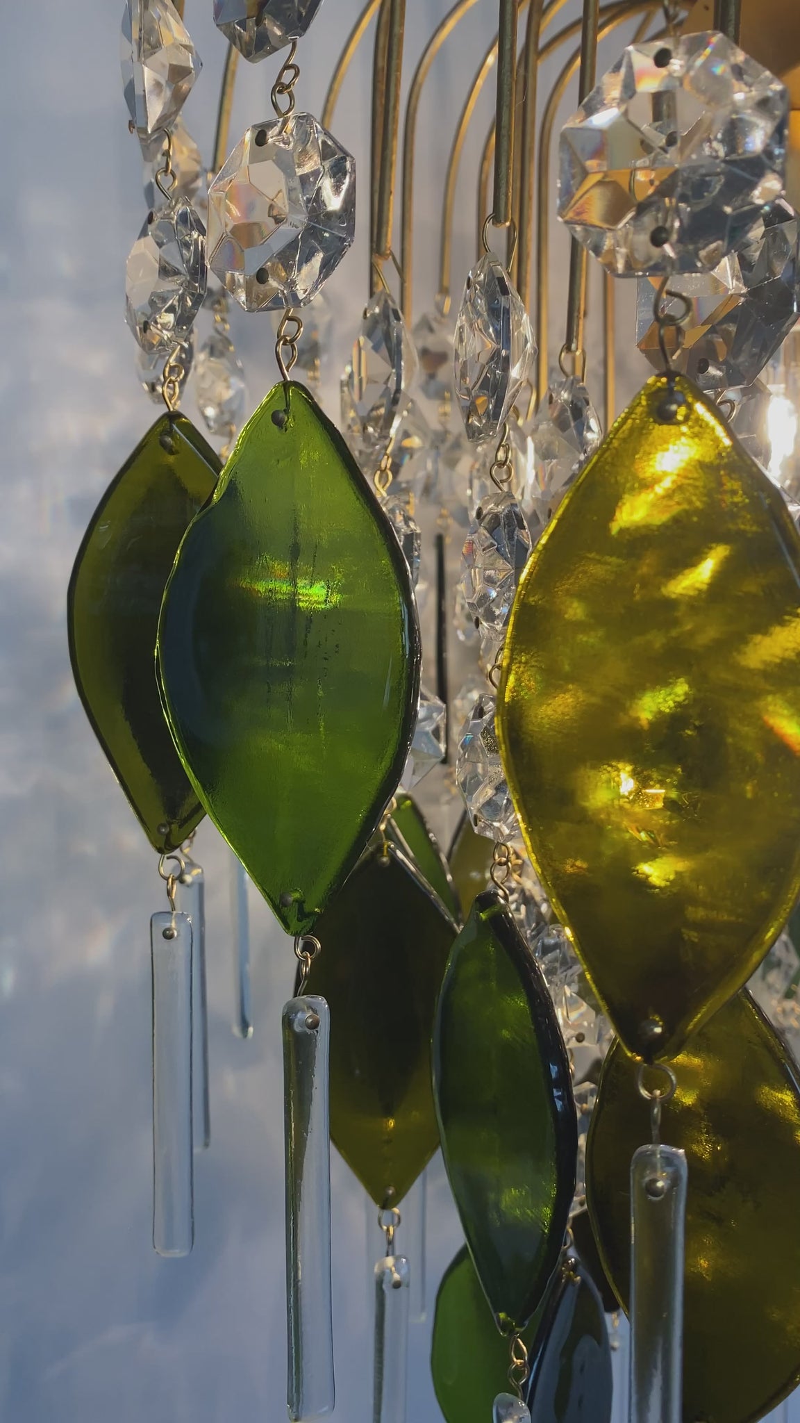 This piece has 60 unique deep olive / green oval drops made from an impressive 11 champagne bottles. An abundance of vintage crystal and finished with clear long rectangle drops from recycled glass.