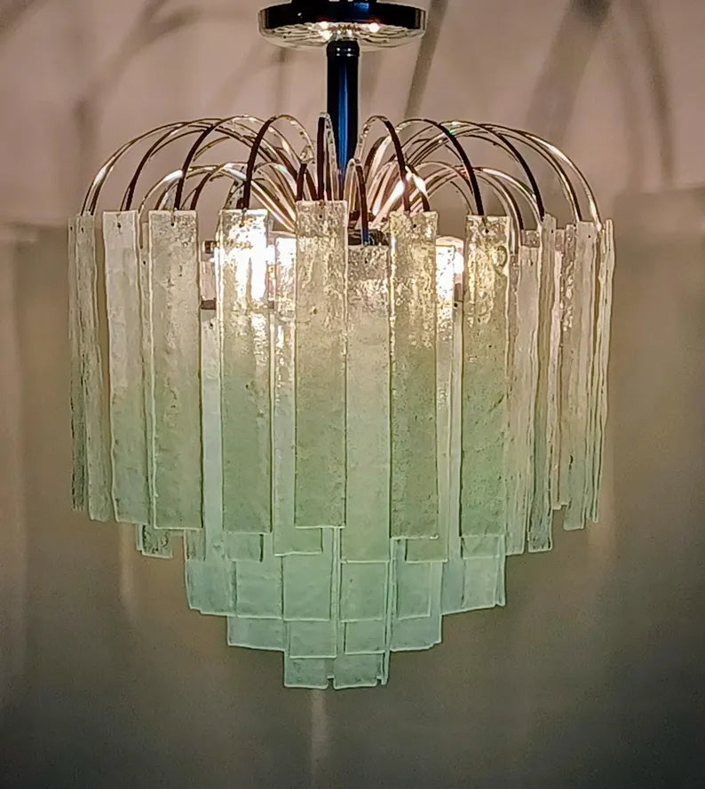 Feast your eyes on our bespoke fused glass strip fountain chandelier.