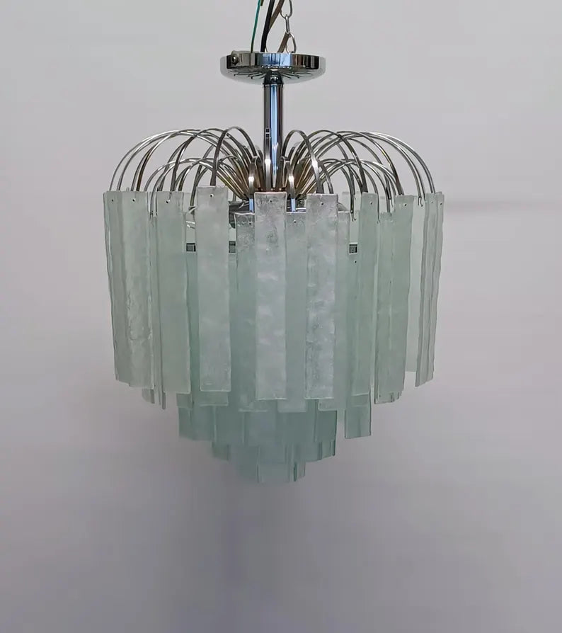 This unique light is hand-made from 100% recycled glass. The stunning chrome frame holds an abundance of iridescent strips which cascade from 5 graduated layers.